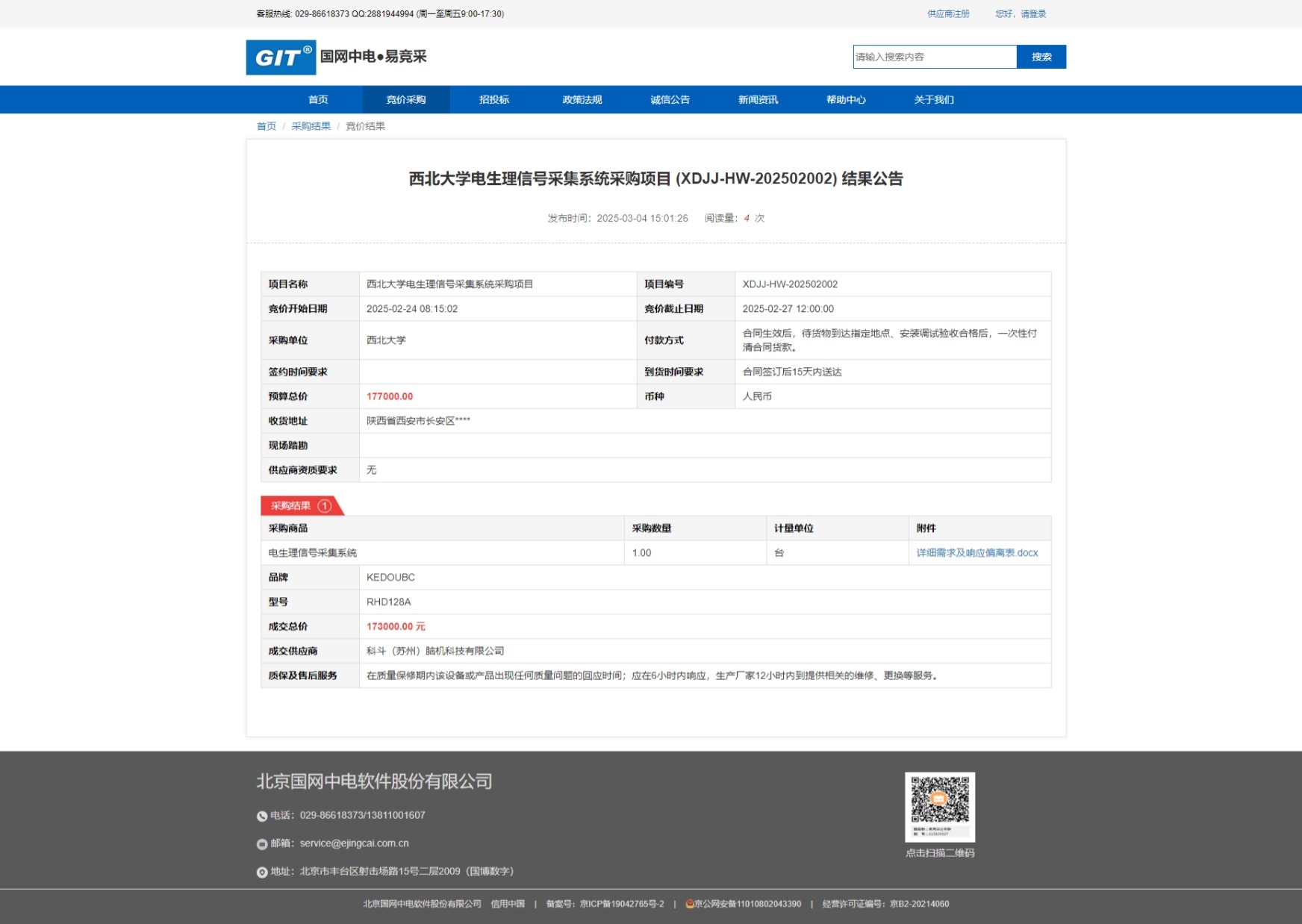 开云手机网页版登录入口电生理信号采集系统采购项目 (XDJJ-HW-202502002) 竞价结果公告 作者: 编辑:采购与招标办公室 时间:2025-03-04 原公告链接:https://www.ejingcai.com.cn/site/bidding/detail/16713