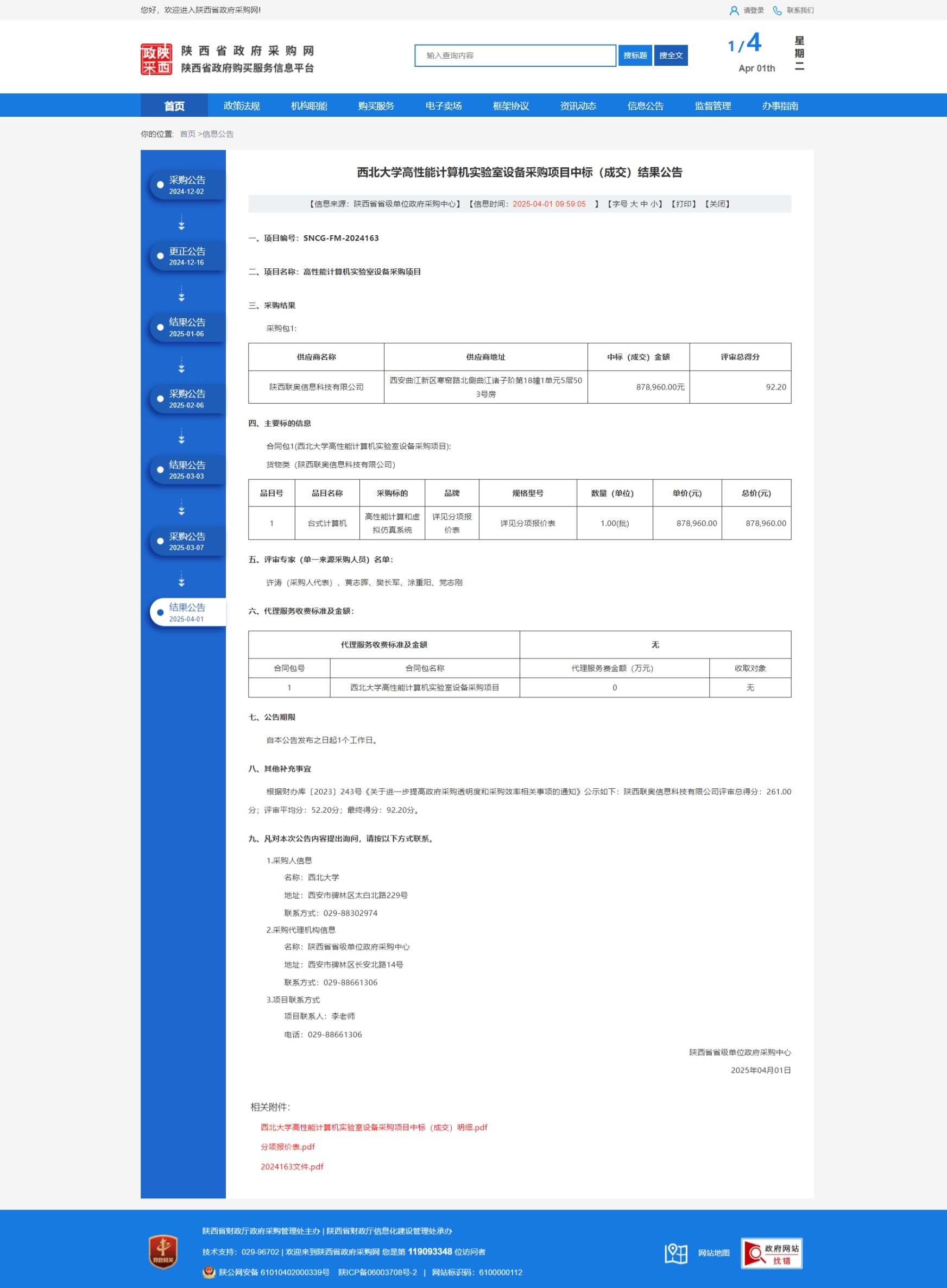 开云手机网页版登录入口高性能计算机实验室设备采购项目中标(成交)结果公告 作者: 编辑:采购与招标办公室 时间:2025-04-01 原公告链接:https://www.ccgp-shaanxi.gov.cn/freecms/site/shaanxi/ggxx/info/2025/8a69c0959566cd7e0195eef3776f2f16.html?noticeType=001021¬iceId=b788f147-0e9e-11f0-8063-08c0eb20c666