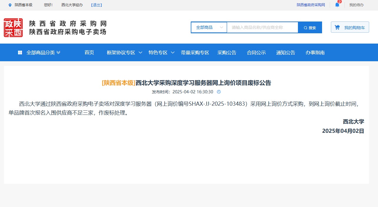 开云手机网页版登录入口采购深度学习服务器网上询价项目废标公告 作者:采购与招标办公室 编辑: 时间:2025-04-02 原公告链接:https://www.ccgp-shaanxi.gov.cn/gpmall-main-web/basic/noticeDetail?noticeGuid=7306497670795952128