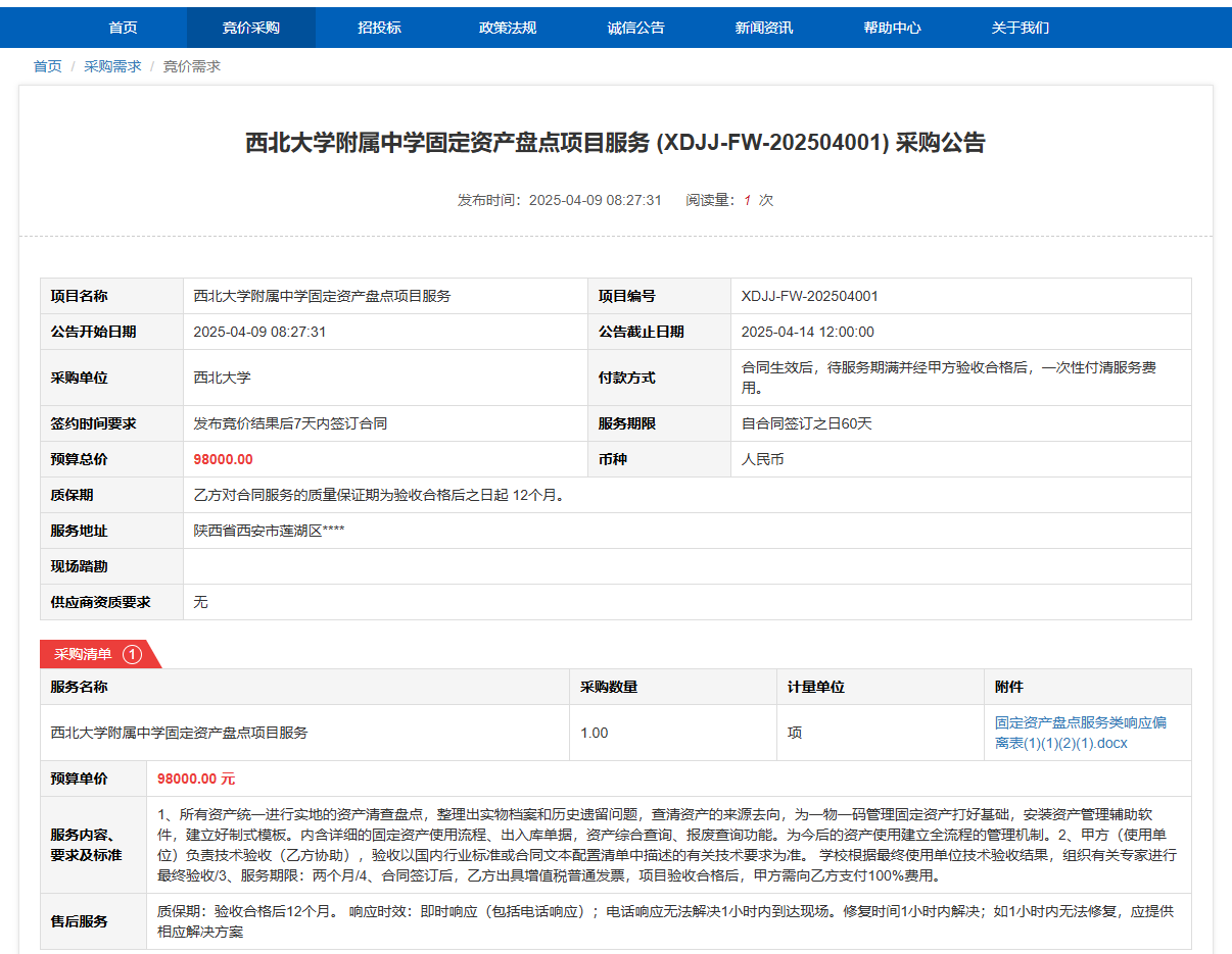 开云手机网页版登录入口附属中学固定资产盘点项目服务(XDJJ-FW-202504001)竞价采购公告 作者:采购与招标办公室 编辑: 时间:2025-04-09 原公告链接:https://www.ejingcai.com.cn/site/bidding/detail/17501