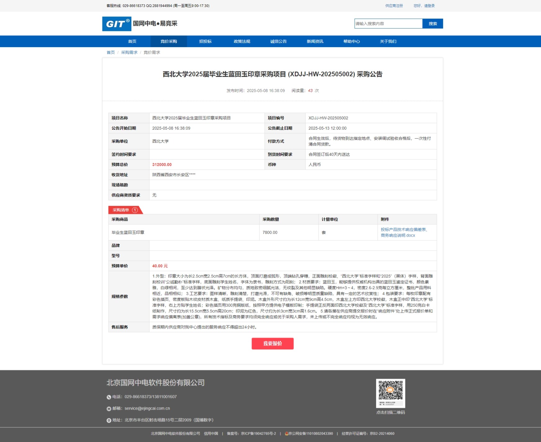 开云手机网页版登录入口2025届毕业生蓝田玉印章采购项目 (XDJJ-HW-202505002) 竞价采购公告 作者: 编辑:采购与招标办公室 时间:2025-05-09 原公告链接:https://www.ejingcai.com.cn/site/bidding/detail/18114