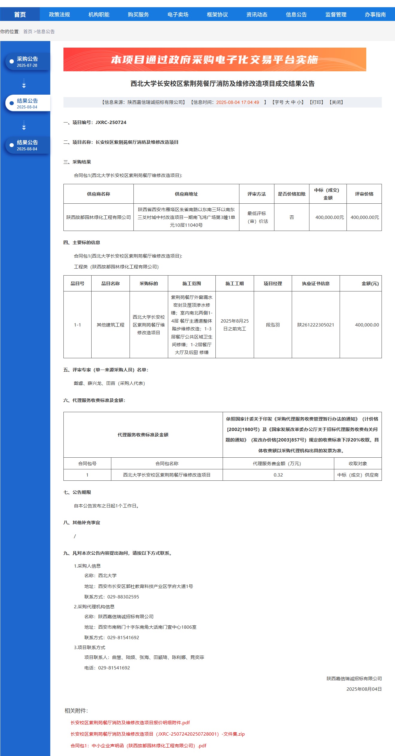 开云手机网页版登录入口长安校区紫荆苑餐厅消防及维修改造项目成交结果公告 作者: 编辑:党丹珩 时间:2025-08-04 公告地址:http://www.ccgp-shaanxi.gov.cn/freecms/site/shaanxi/ggxx/info/2025/8a69c4d59860f6420198744983276ed2.html?noticeType=001023¬iceId=1f58d820-7114-11f0-8063-08c0eb20c666