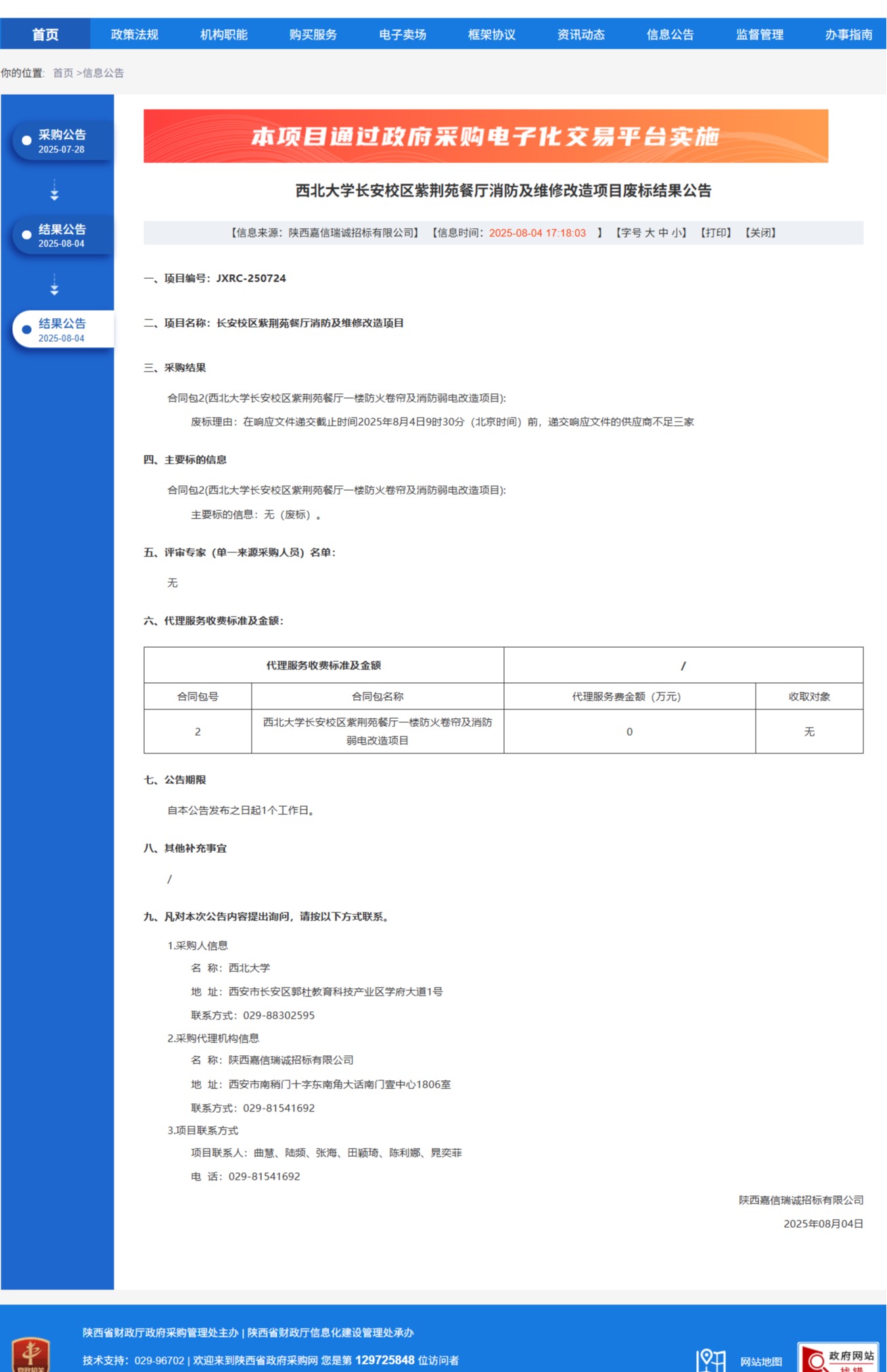 开云手机网页版登录入口长安校区紫荆苑餐厅消防及维修改造项目废标结果公告 作者: 编辑:党丹珩 时间:2025-08-04 公告地址:http://www.ccgp-shaanxi.gov.cn/freecms/site/shaanxi/ggxx/info/2025/8a69c0c89860f6020198742efac05b51.html?noticeType=001006¬iceId=f838eaa2-7115-11f0-8063-08c0eb20c666