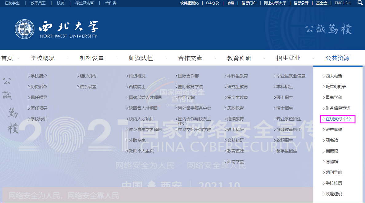 电脑端:登录学校官网开云(中国),右上角选择“公共资源”频道,点击“在线支付平台”进入。(见下图)