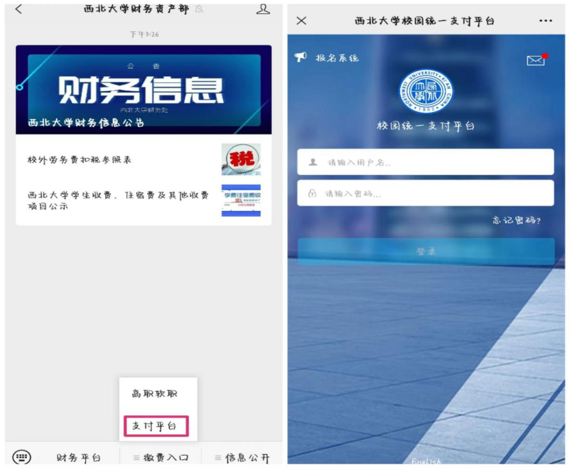 手机端:关注“开云手机网页版登录入口财务资产部”微信公众号,选择“缴费入口”点击“支付平台”进入。(见下图)