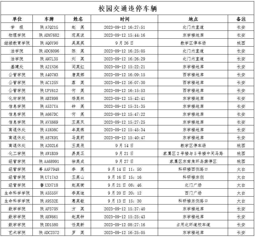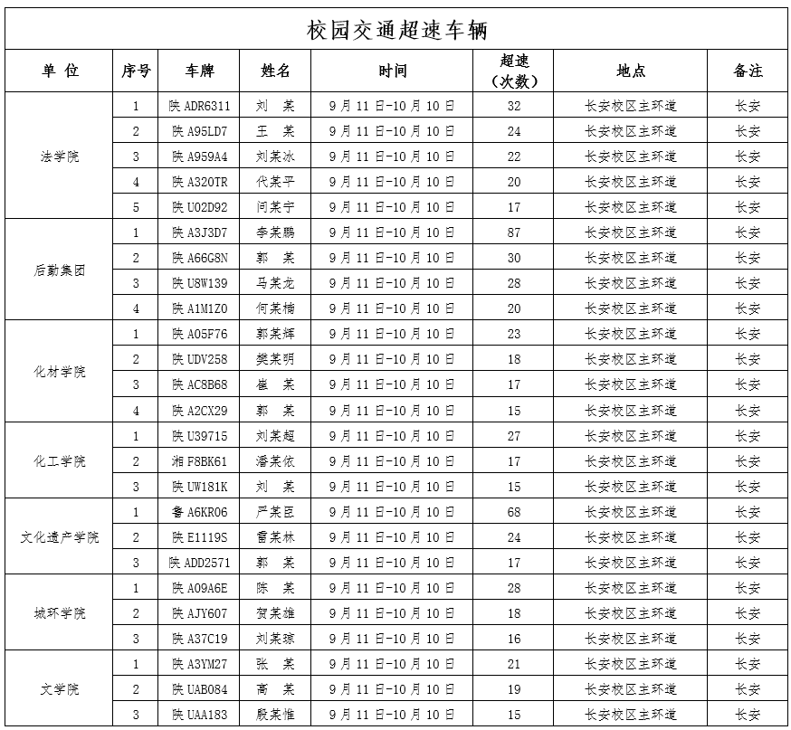 近期,省内部分高校因校内机动车行驶速度过快引发多起交通事故,造成师生员工人身、财产安全损失,教训极为深刻。为加强校内道路交通管理,规范校内交通秩序,根据《开云手机网页版登录入口校园道路交通管理办法》的通知要求,现将2023年9月11日至10月10日校园交通屡次违章车辆予以曝光,学校道路交通安全委员会决定,对多次违章车辆即日起禁止进入校园,并将违章车辆车主信息通报到所在单位,所在单位负责对师生进行交通安全教育和日常管理。