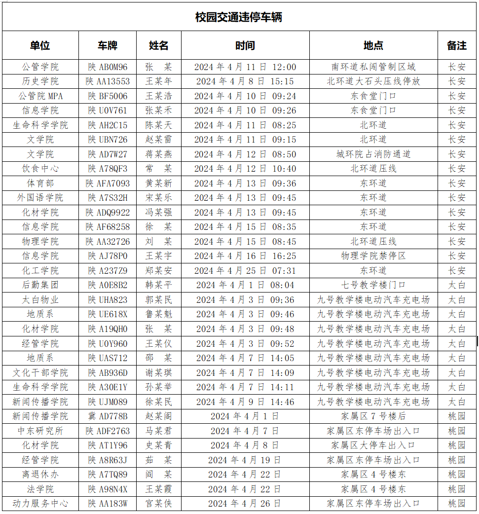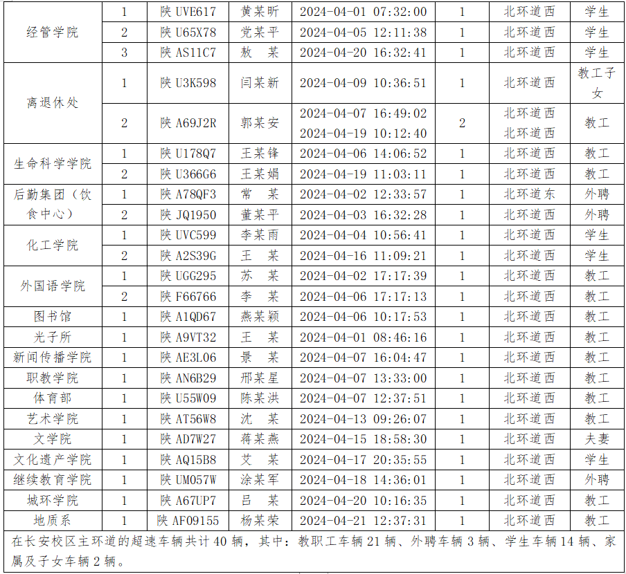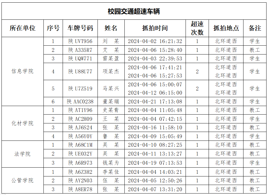 为加强校内道路交通安全管理,规范校内交通秩序,根据《开云手机网页版登录入口校园道路交通管理办法》有关要求,现将2024年4月校园交通违章车辆予以曝光,4月份教工超速车辆占52%、学生超速车辆占35%、外聘职工及教工家属车辆占12%,请所在单位加强对本单位违章师生员工的教育和管理,对于校内曝光超速的学生车辆将取消下一年度的通行证办理资格。