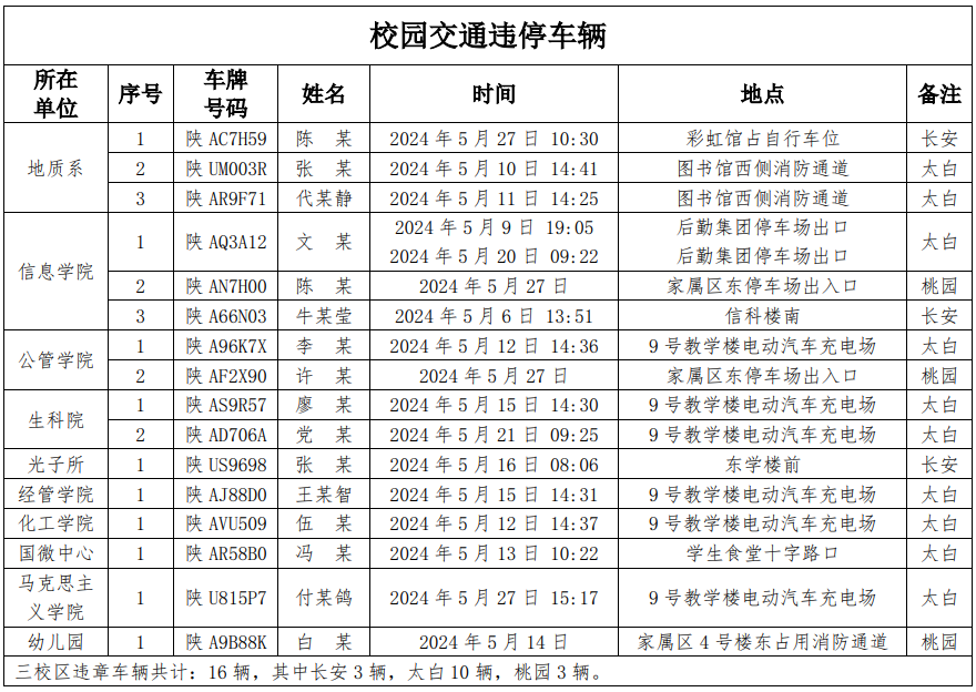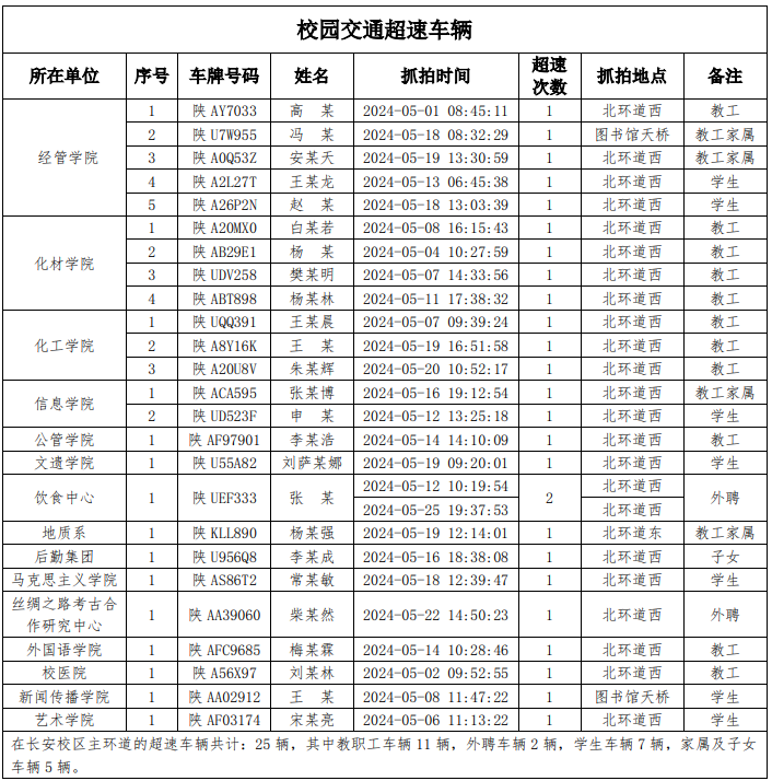 为加强校内道路交通安全管理,规范校内交通秩序,根据《开云手机网页版登录入口校园道路交通管理办法》有关要求,现将2024年5月校园交通违章车辆予以曝光,所在单位负责对本单位违章师生员工进行交通安全教育和日常管理,对于校内曝光超速的学生车辆将取消下一年度的通行证办理资格。