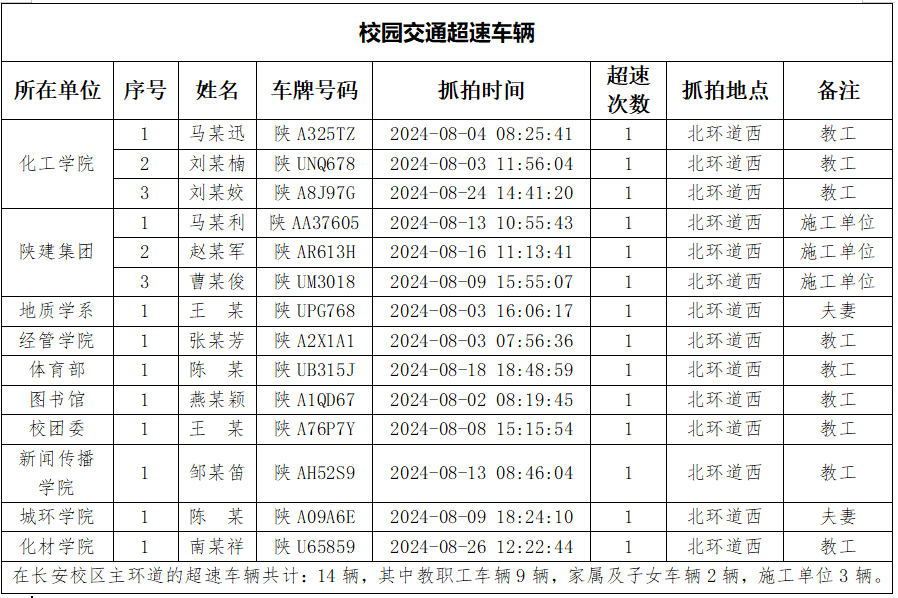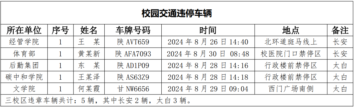 为一步加强校园交通管理,保障校园交通安全有序,维护学校正常的教学、科研和生活秩序以及师生员工的人身财产安全,根据《开云手机网页版登录入口校园交通安全管理规定》有关要求, 现将2024年8月校园交通违章车辆予以曝光,具体情况如下表。