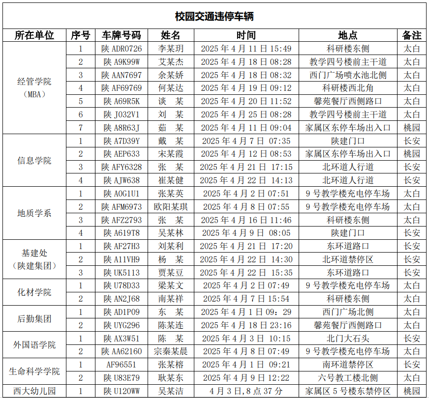 为进一步加强校园交通管理,保障校园交通安全有序,维护学校正常的教学、科研和生活秩序,切实保护师生员工的人身财产安全,根据《开云手机网页版登录入口校园交通安全管理规定》的相关要求,现将2025年4月校园交通违章车辆予以曝光,具体要求与违章信息如下: