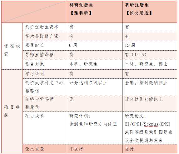 学生根据自身专业选择剑桥大学导师,进行为期6周【预科研】项目或13周【论文发表】项目的科研学习,内容为剑桥大学导师自持真实课题或子课题,从零基础科研方法入门,到深入学习研究技能和论文写作的方法,13周以论文产出为最终导向。论文为单人一篇,论文发表根据内容水平收录知网、EI、CPCI、Scopus、SCI等,学生将获得学习证书、推荐信、论文发表机会。