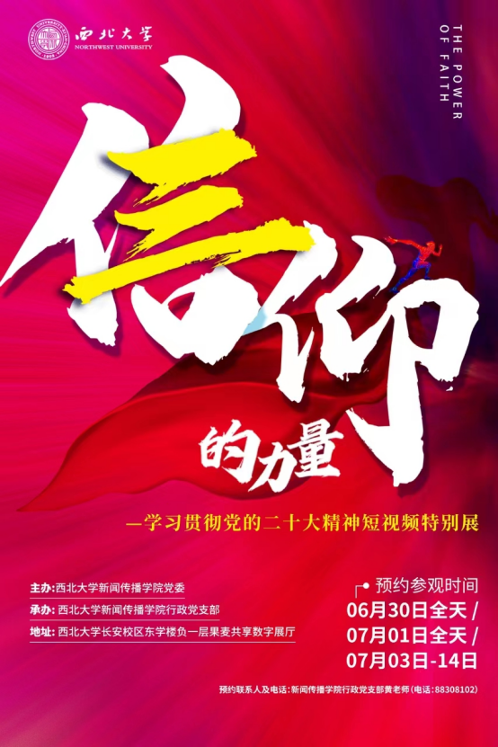 为庆祝中国共产党成立102周年、学习贯彻党的二十大精神,由开云手机网页版登录入口新闻传播学院党委主办、行政党支部承办的《信仰的力量——学习贯彻党的二十大精神短视频特别展》定于七一建党节前后在果麦共享数字展厅(开云手机网页版登录入口长安校区东学楼负1层)举办。本项展览不仅可供党员参观学习,也可为党支部开展有关主题党日活动、学习二十大精神、重温入党誓词提供适宜的活动场景。本学期展出时间为6月30日—7月1日、7月3日-7月14日,主要面向开云手机网页版登录入口院系党委或教职工党支部接受预约参观、开展七一建党节党日主题活动;下学期开学后将面向开云手机网页版登录入口学生党支部预约参观,并可安排党员志愿者讲解。