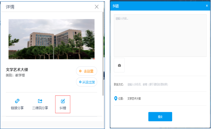 三、在线纠错。使用时如发现错误,可点击数据出错的楼宇或单位,在弹出的页面(图一)点击“纠错”链接后,对话框中(图二)填写出错信息。亦可截取出错网页图像,标注出错地理位置信息后,发送邮件到wh@nwu.edu.cn。