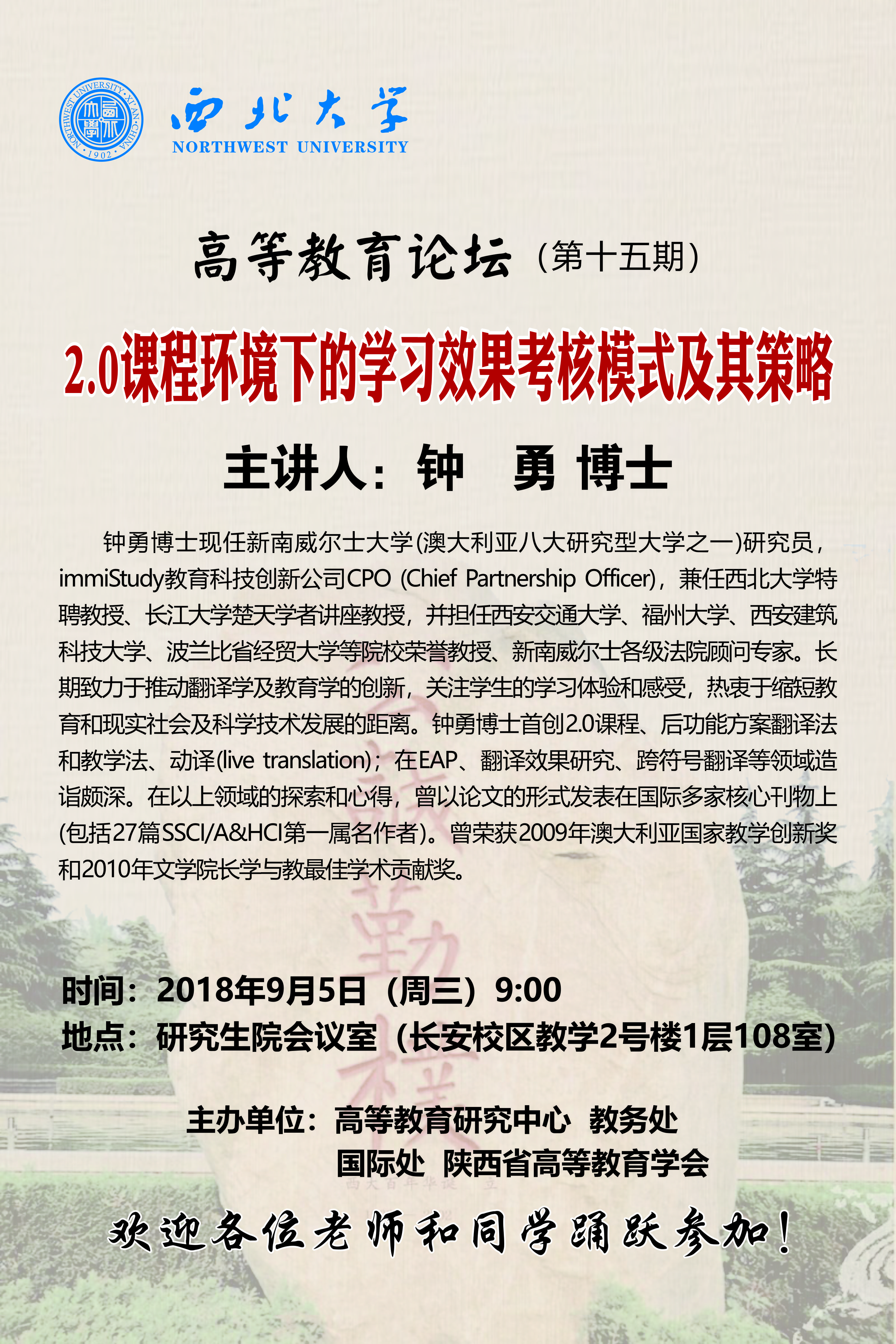 开云手机网页版登录入口"高等教育论坛"(第十五期) 作者: 编辑: 时间:2018-09-03 16:59 校内各有关单位: “高等教育论坛”第十五期即将举行,现将具体情况通知如下: 讲座题目:2.0课程环境下的学习效果考核模式及其策略主讲嘉宾:钟 勇 博士讲座时间:2018年9月5日(周三)上午9:00讲座地点:研究生院会议室(长安校区教学2号楼1层108室)主办单位:高等教育研究中心、教务处、国际处、陕西省高等教育学会欢迎各位老师和同学踊跃参加!窗体顶端联系人:伍小东 13891830894