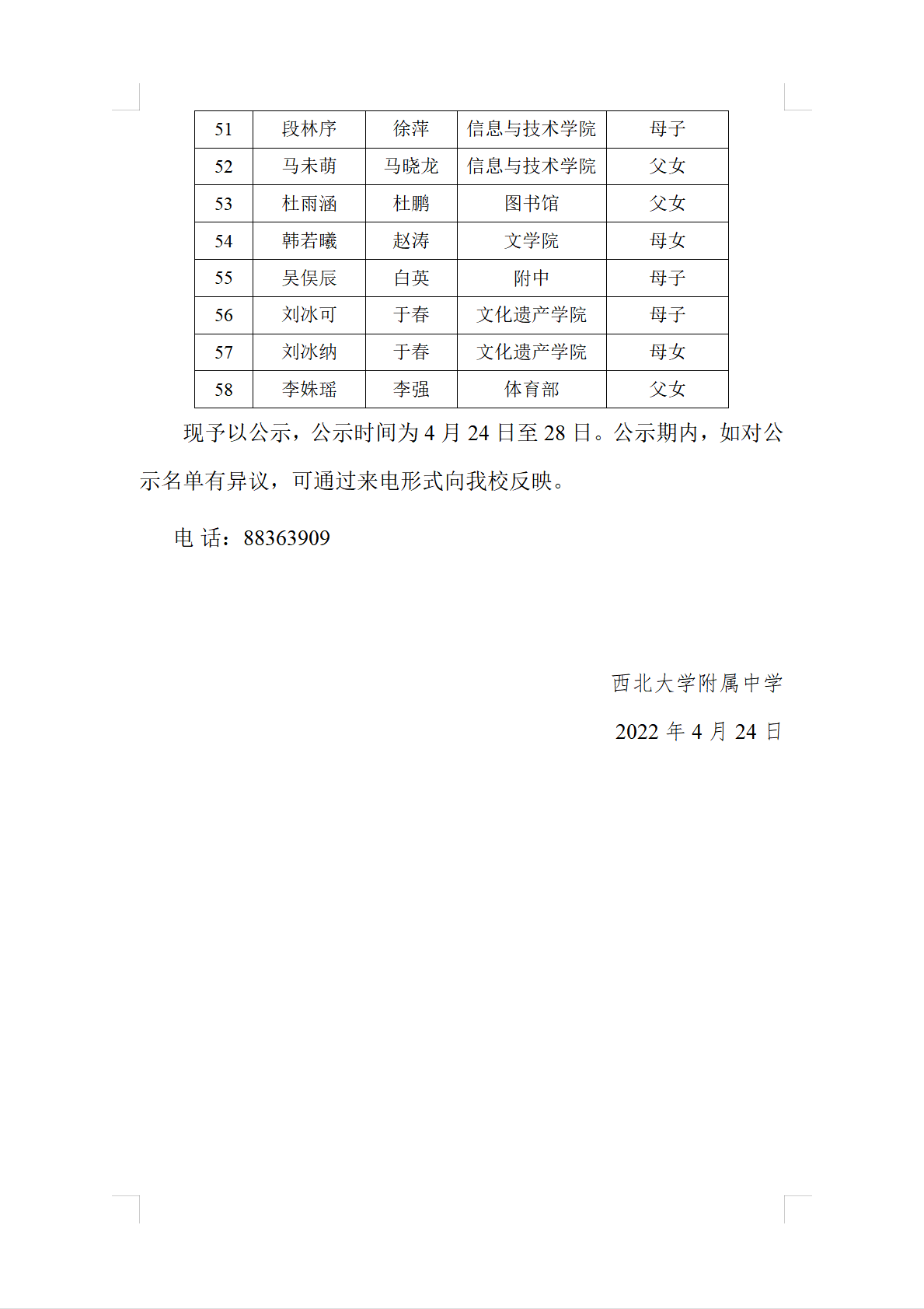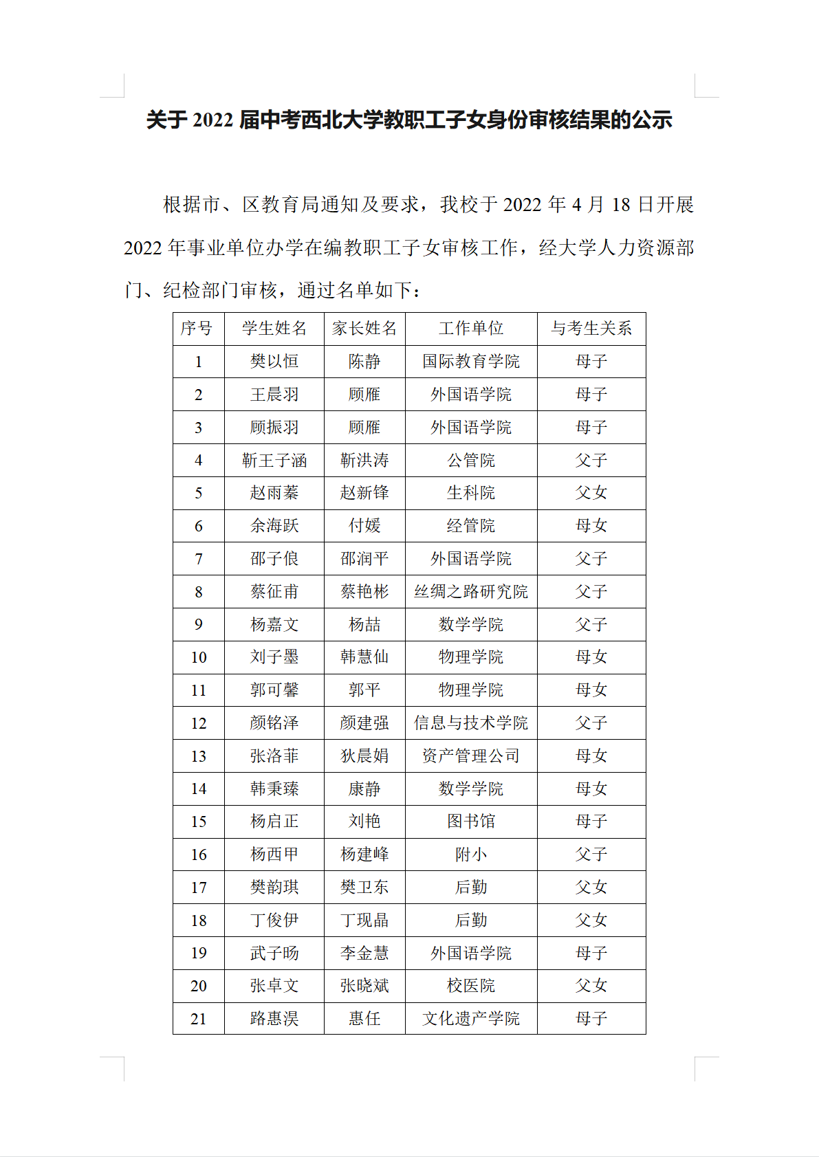 关于2022届中考开云手机网页版登录入口教职工子女身份审核结果的公示