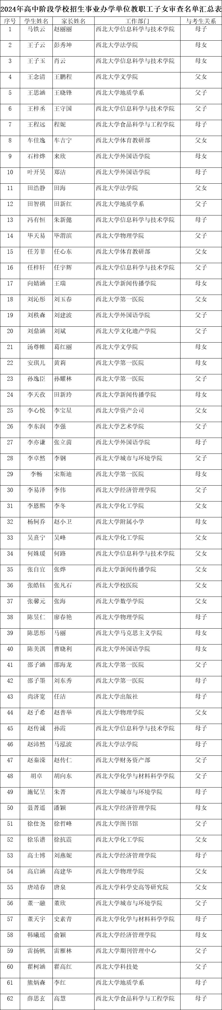 关于2024年高中阶段学校招生开云手机网页版登录入口 正式事业编制的教职工直系初中应届毕业子女审查结果的公示 作者:附中 编辑:附中 时间:2024-05-13 根据市、区教育局通知及要求,开云手机网页版登录入口于2024年5月6日开展2024年高中阶段学校招生开云手机网页版登录入口正式事业编制的教职工直系初中应届毕业子女审查工作。经大学人力资源部门、纪检部门审核,通过名单如下(按学生姓氏笔画数排序): 现予以公示,公示时间为5月13日至5月19日。公示期内,如对公示名单有异议,可通过来电形式向开云手机网页版登录入口反映。 电 话:88363909 开云手机网页版登录入口附属中学 2024年5月13日