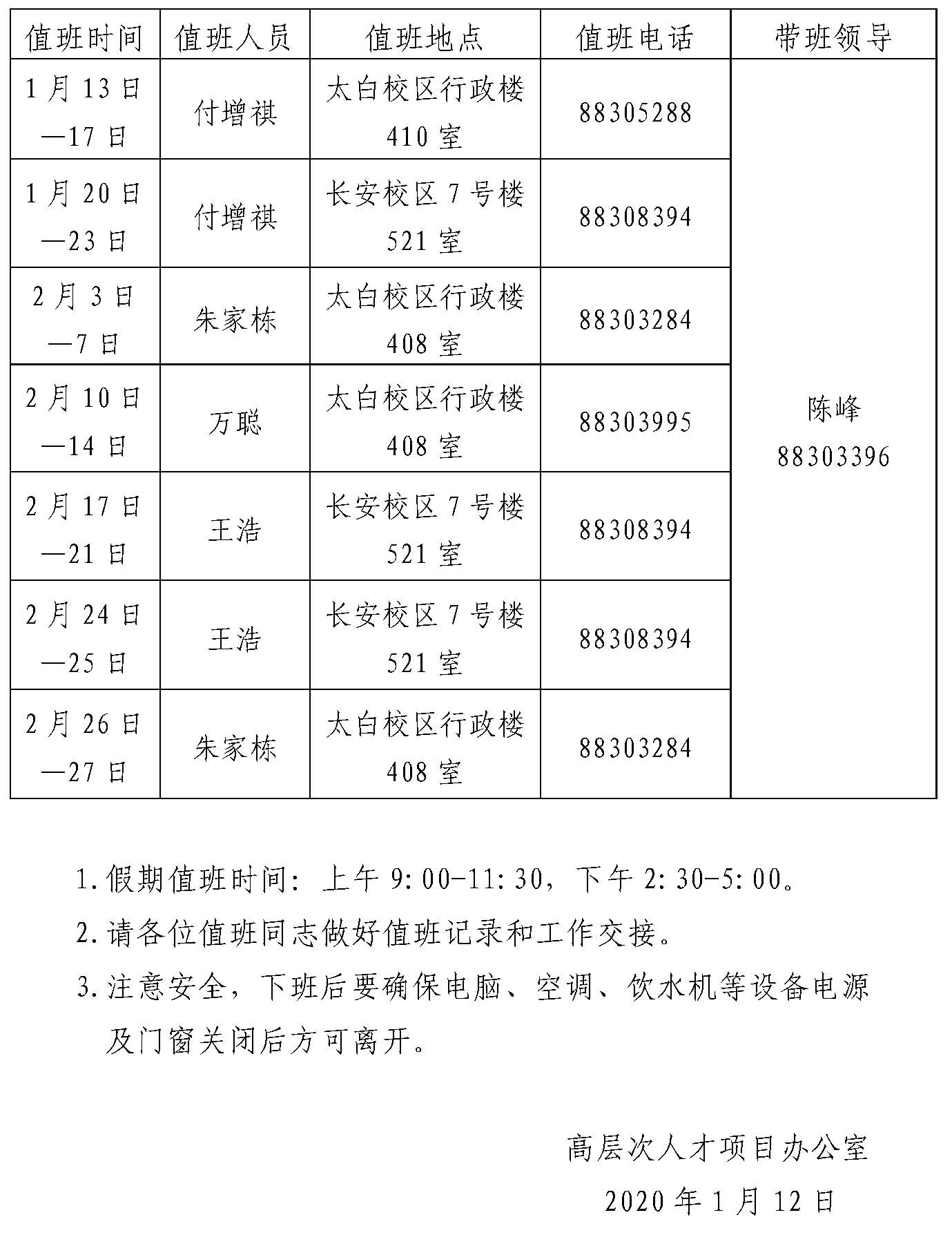 高层次人才项目办公室2020年寒假值班安排