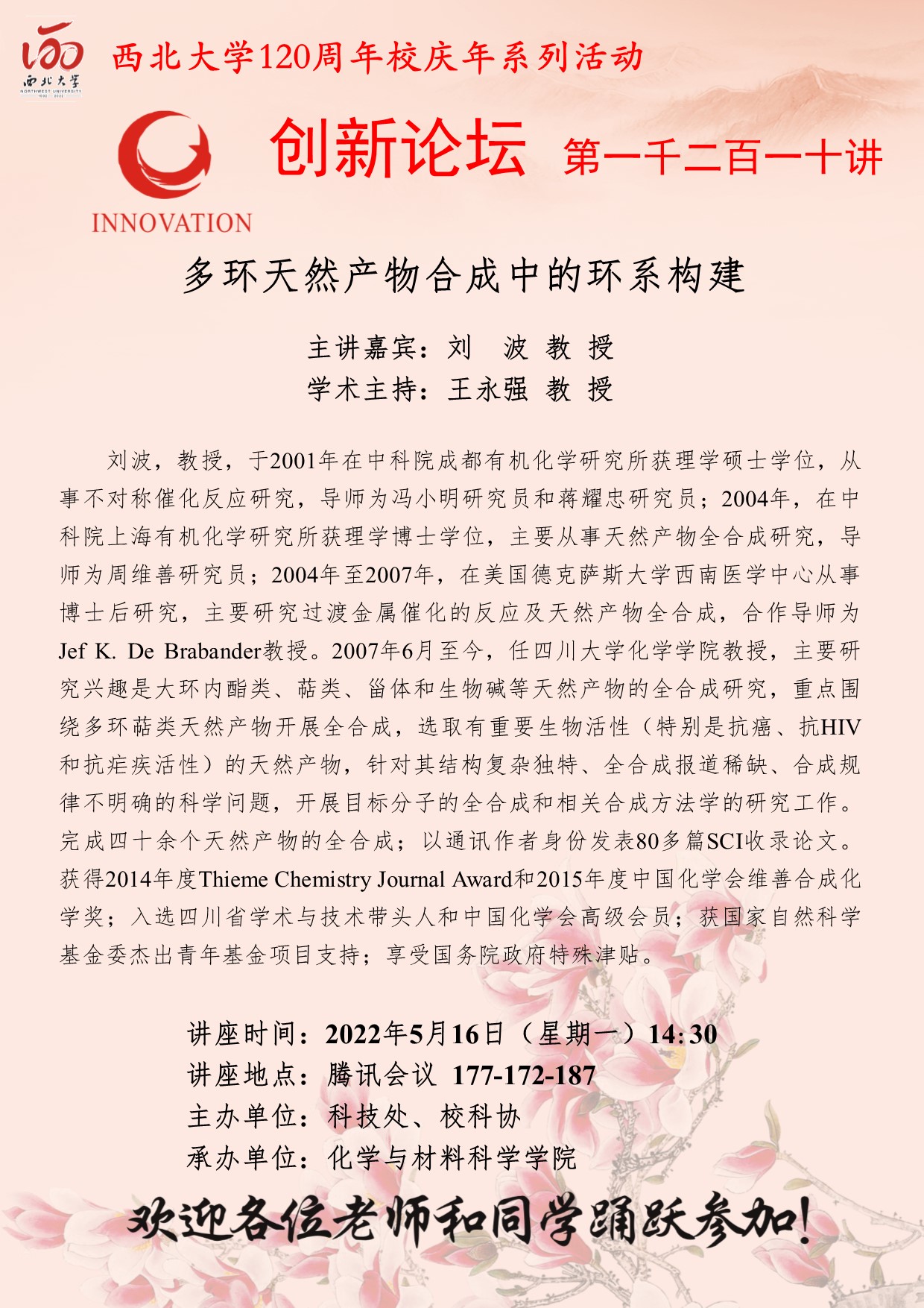 开云手机网页版登录入口创新论坛第一千二百一十讲暨120周年校庆年系列活动:多环天然产物合成中的环系构建