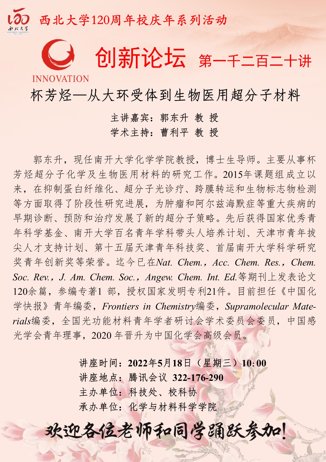 开云手机网页版登录入口创新论坛第一千二百二十讲暨120周年校庆年系列活动:杯芳烃—从大环受体到生物医用超分子材料
