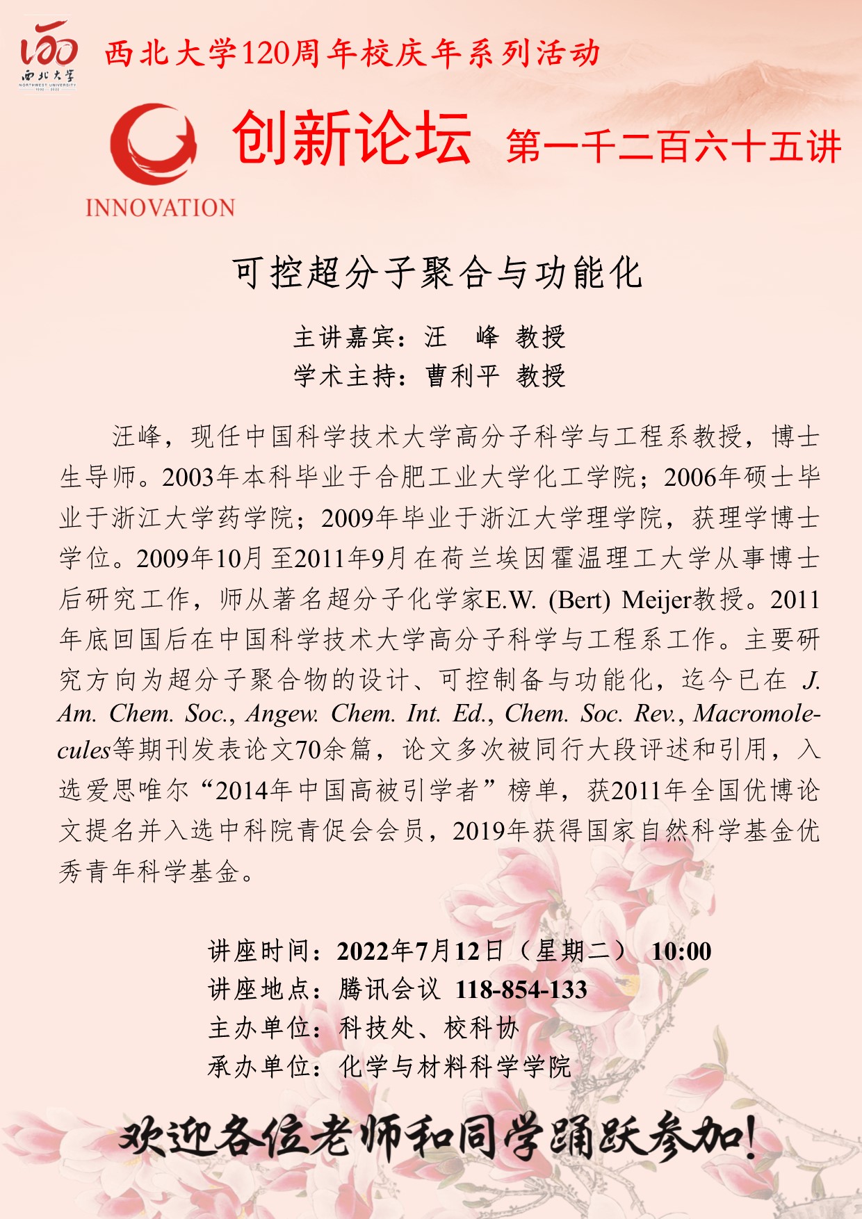 开云手机网页版登录入口创新论坛第一千二百六十五讲暨120周年校庆年系列活动:可控超分子聚合与功能化