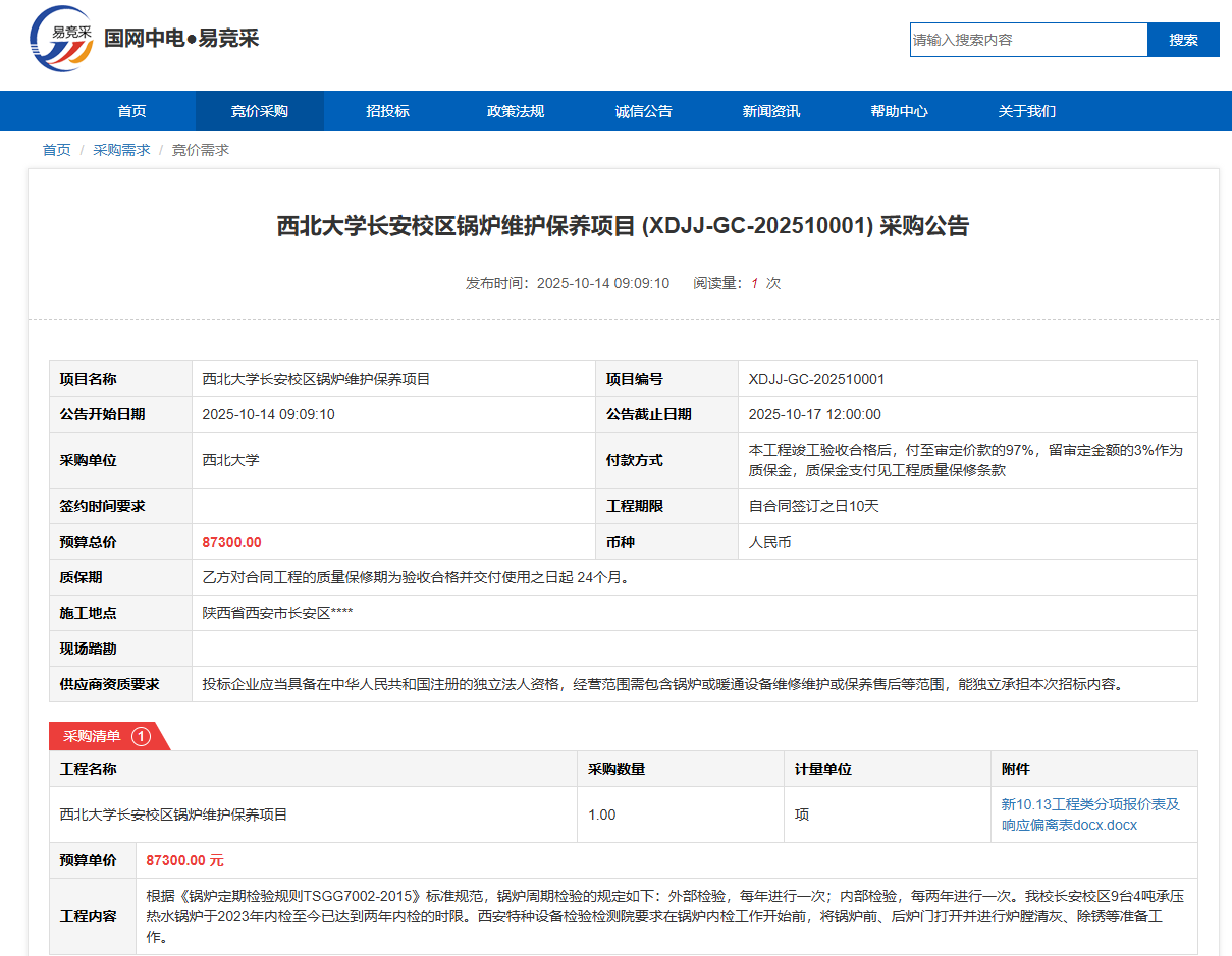 开云手机网页版登录入口长安校区锅炉维护保养项目(XDJJ-GC-202510001)竞价采购公告